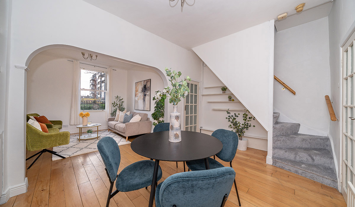 The layout is flexible. It opens into a hall with a good-size L-shaped open plan living space to the right. It leads from a dual aspect living room and through to the dining area and kitchen. Off it is an internal room that is currently set-up as a study.