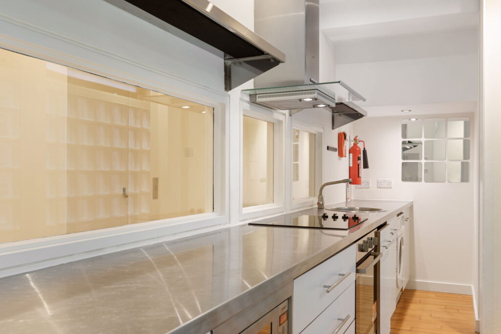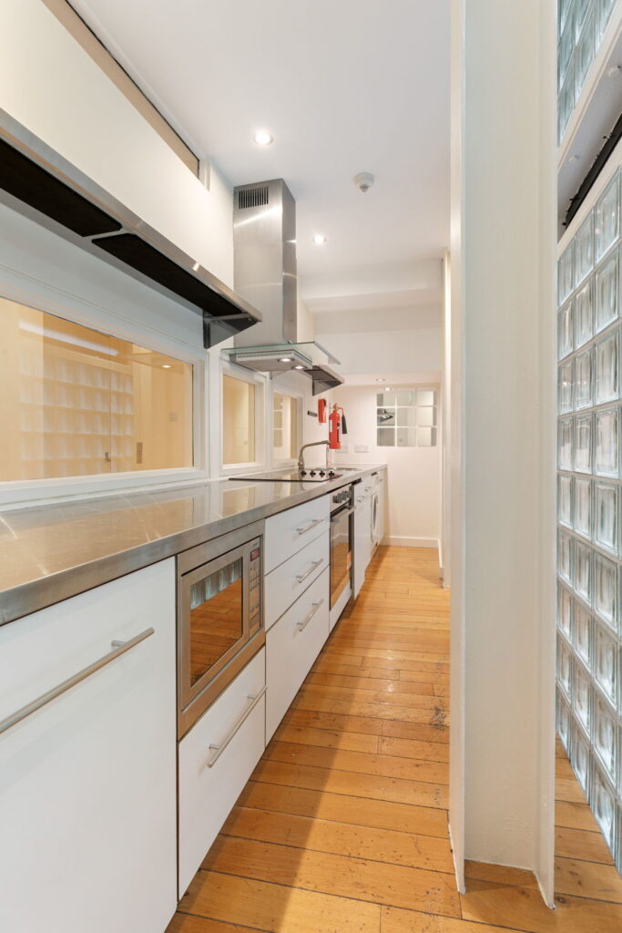 Galley in style, the kitchen is washed in diffuse, natural light thanks to the use of glass blocks in part of its exterior wall. It has fashionable stainless-steel countertops.