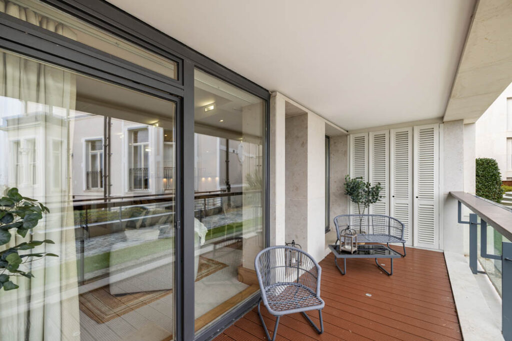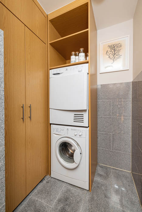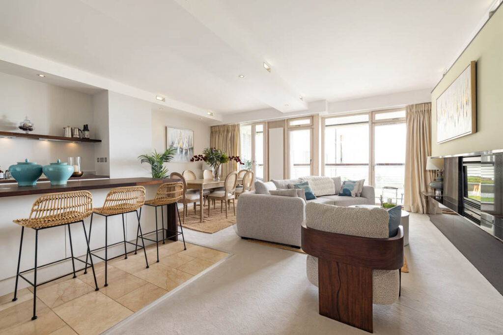 Set on the ground floor, it has high ceilings, and the living space is washed in light thanks to its floor-to-ceiling glazing and sea views.