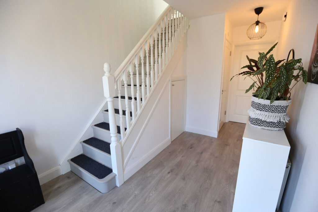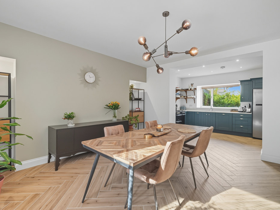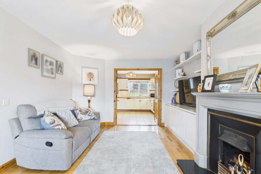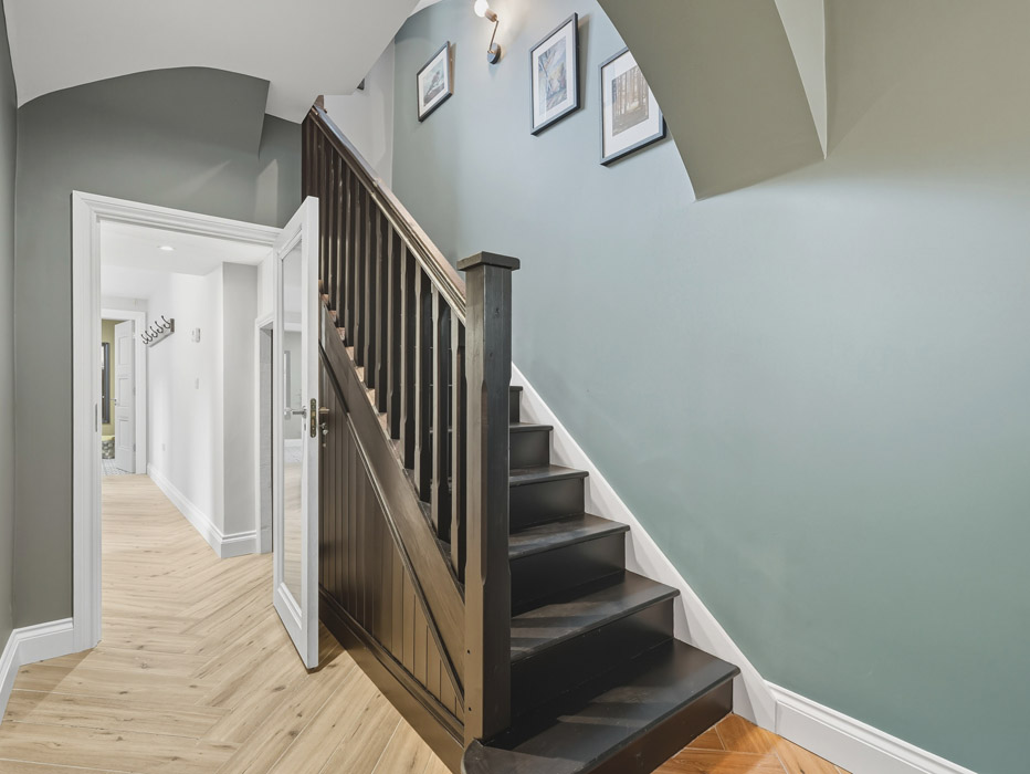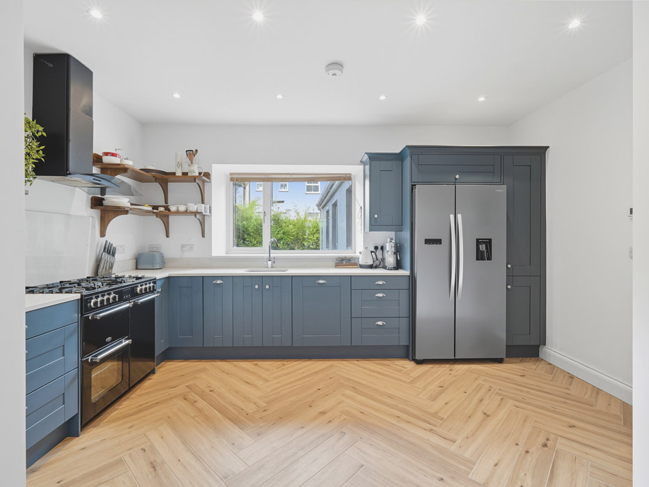 It has two sitting rooms, one to the front at entrance level, where the kitchen is set to the back of the house, and a large utility and guest bathroom in the return.