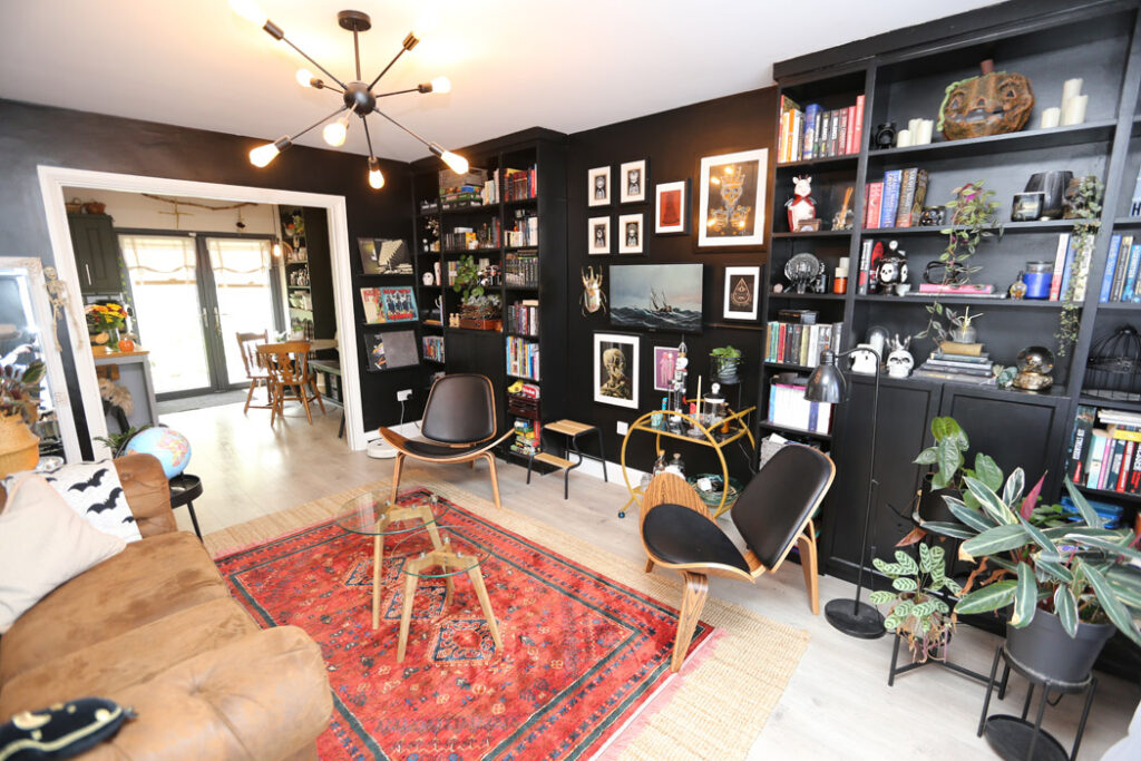 It has a broken plan ground floor with the walls of the living room painted an inky black and filled with bookshelves and a gallery wall of art.