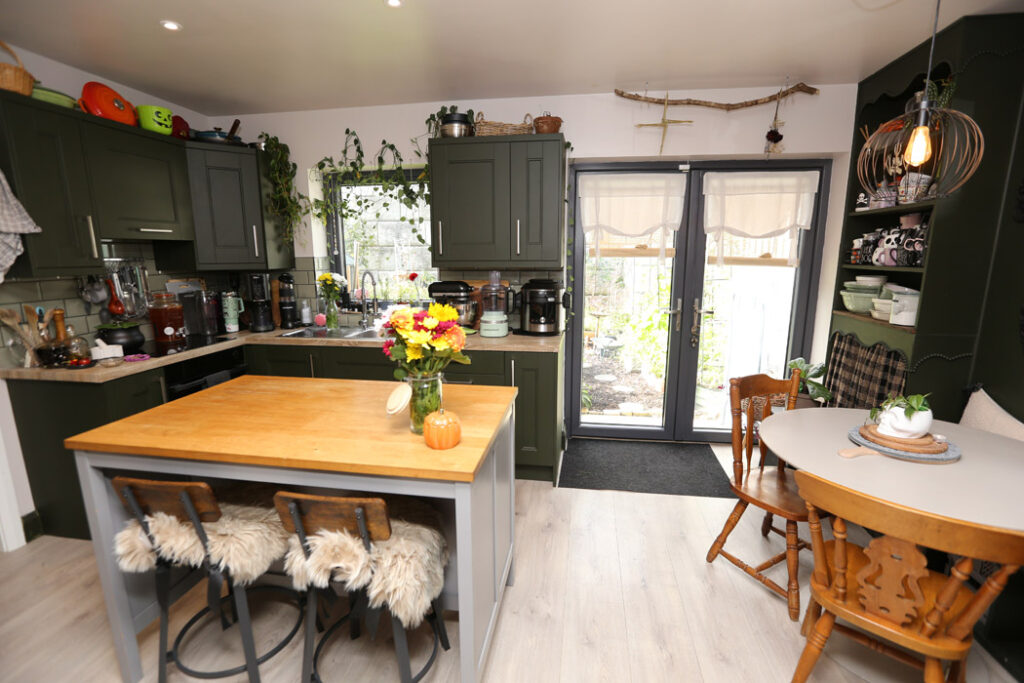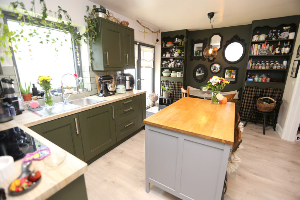 The eat-in kitchen has deep green units with a light wood-effect countertop, while also doffing its cap at the countrycore trend with the matching open-shelved dressers filled with spices and condiments.