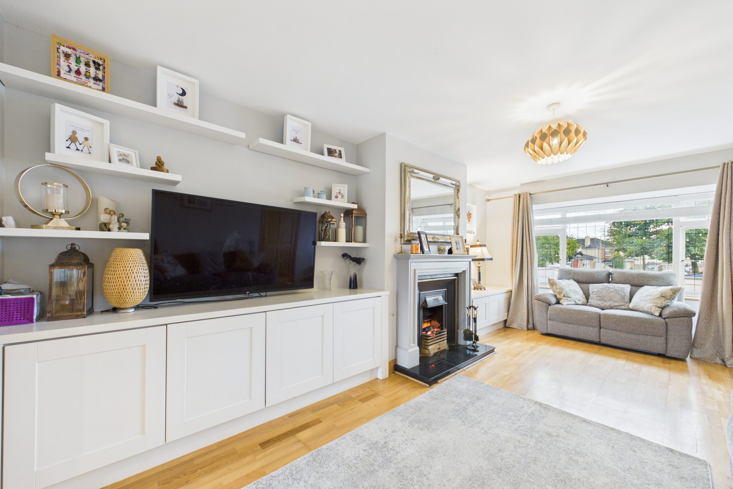 It has interconnecting rooms at entrance level, with the lounge set to the front and double doors leading through to the kitchen to the rear.