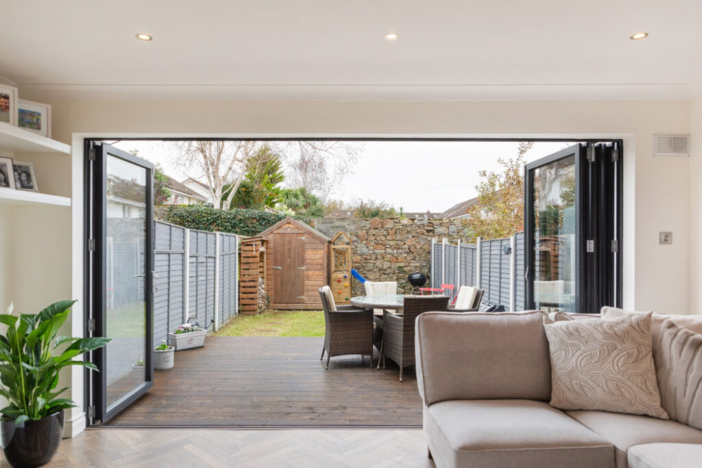 A garden room and Dublin Bay views from the exterior of this spacious bungalow, sequestered in a quiet cul-de-sac in Blackrock.