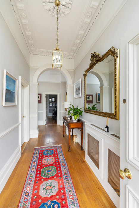 The family home has ceiling heights that extend to 3.4 metres, sash timber windows, and opens into an L-shaped entrance hall that conceals the stairs from view.