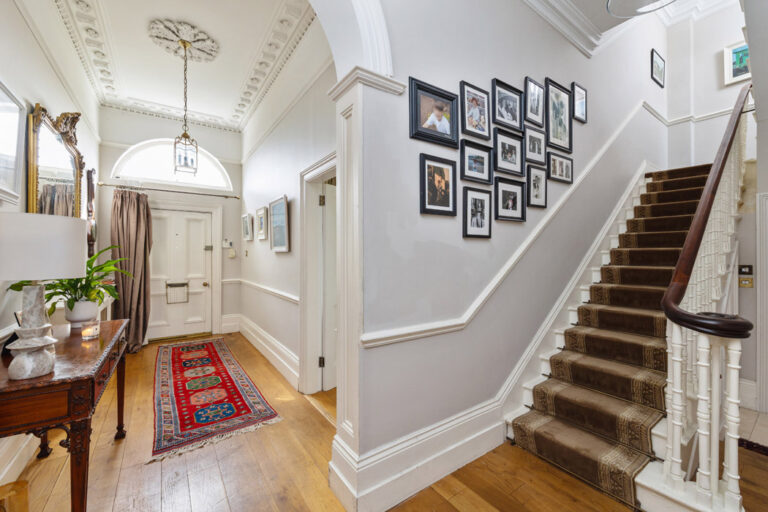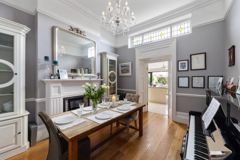 The family home has ceiling heights that extend to 3.4 metres, sash timber windows, and opens into an L-shaped entrance hall that conceals the stairs from view.