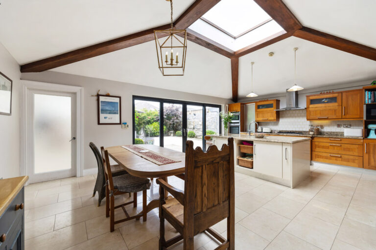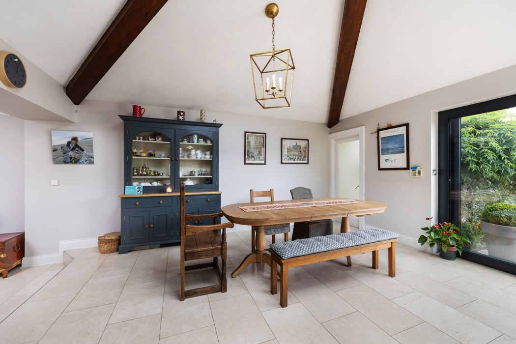 It has timber beam detailing in its pitched roof and leads out to the low-maintenance garden.
