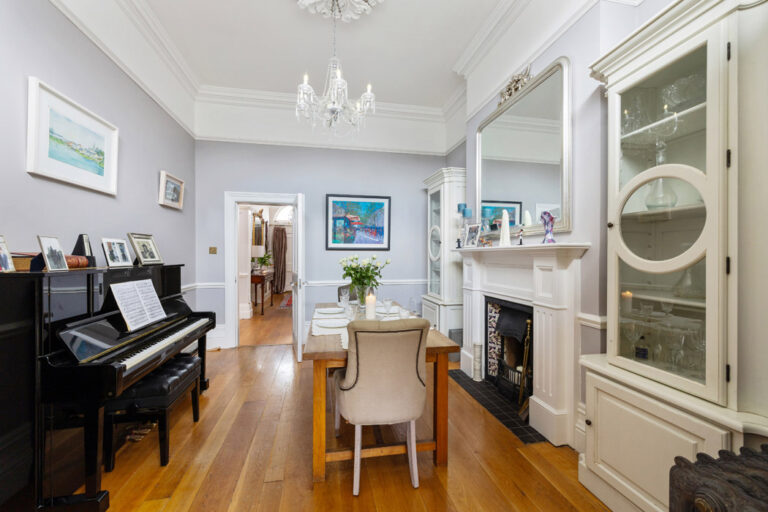 The rest of the ground floor is set to the rear of the stairs and includes a formal dining room and adjacent sitting room, both of which lead through to the large, eat-in kitchen.