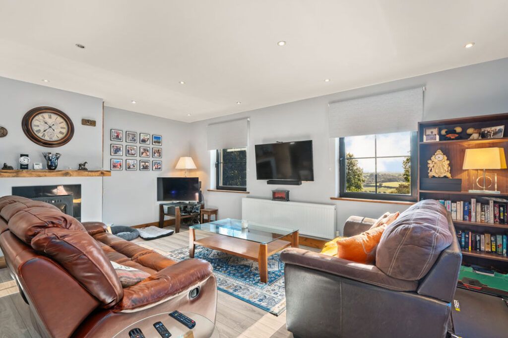 There’s a large utility and guest WC off the kitchen, and the first of its three bedrooms is also at this level.