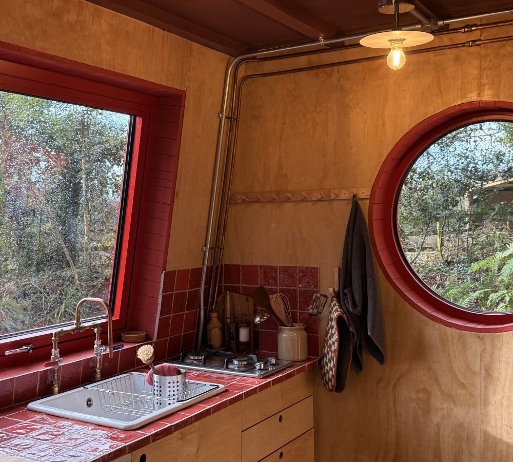 Called Cucu, it is lined in plywood, features lever taps, and has a small two-ring hob and counter to cook and prep food.