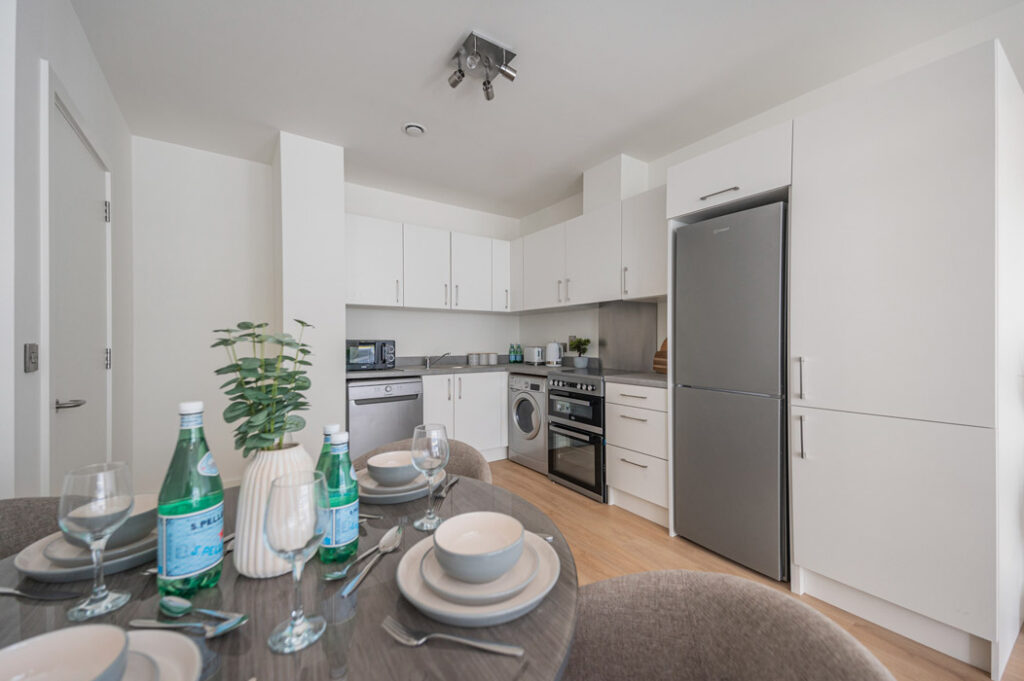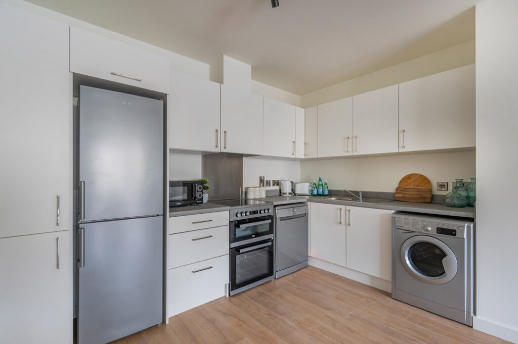 the kitchen in the open-plan living area of the one-bedroom apartment