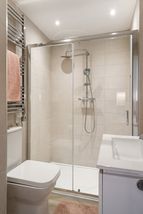 Extending to 59 square meters, the property’s only bathroom, a smartly appointed shower space, is on this level.