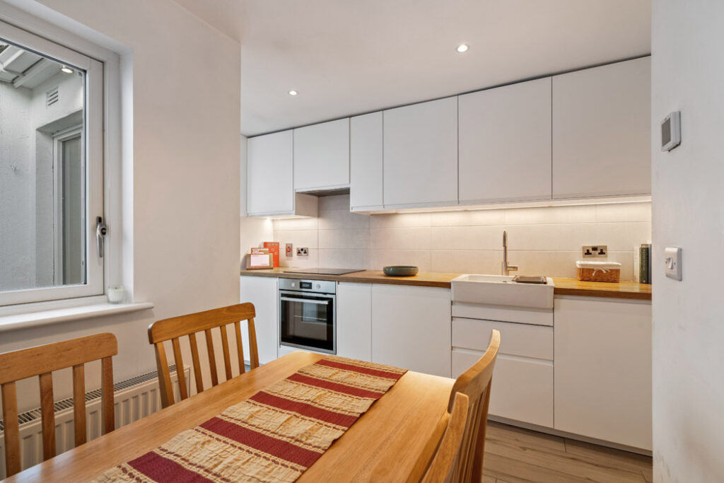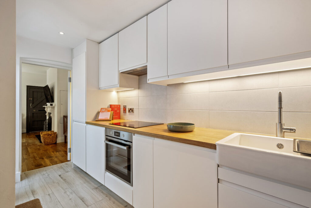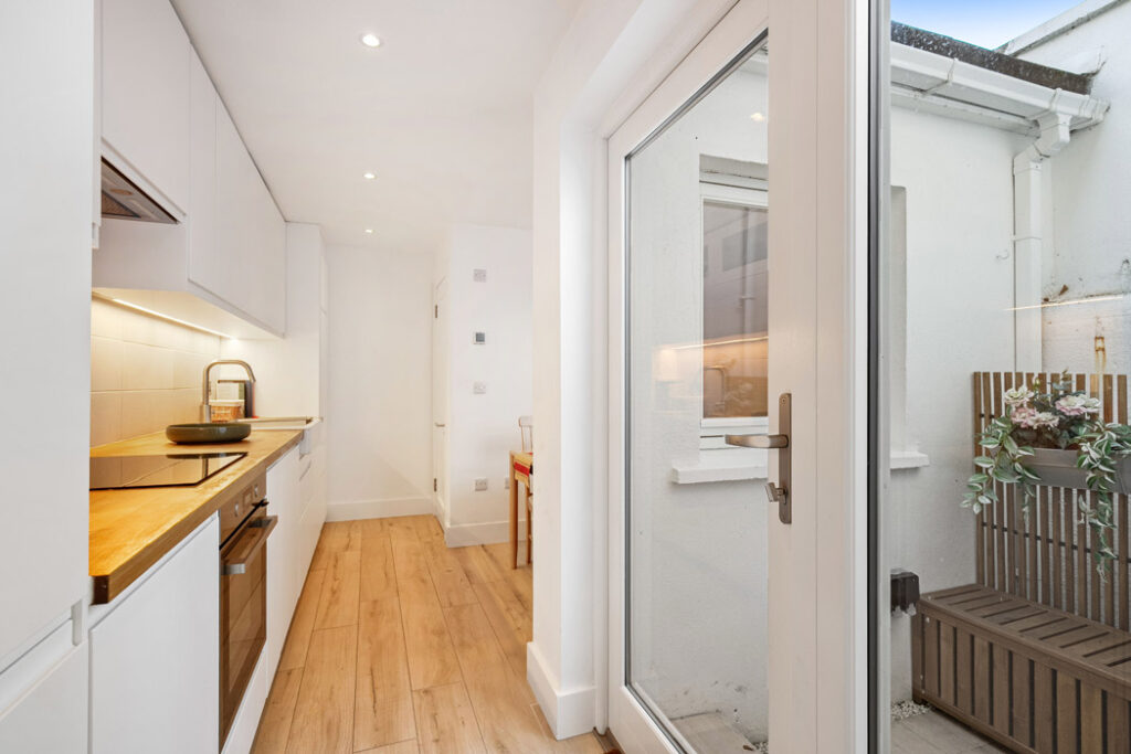 Its units are set out in a galley style, and it benefits from lots of natural light thanks to the glass double doors opening out to the small, enclosed courtyard.