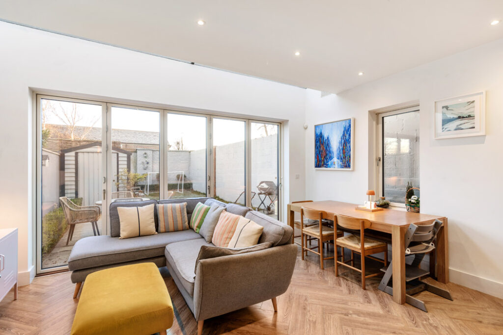 A long roof light washes the lounge area in light, and triple-glazed Aumil sliding doors lead out to landscaped gardens with a patio, perfect for outdoor dining when the weather improves.