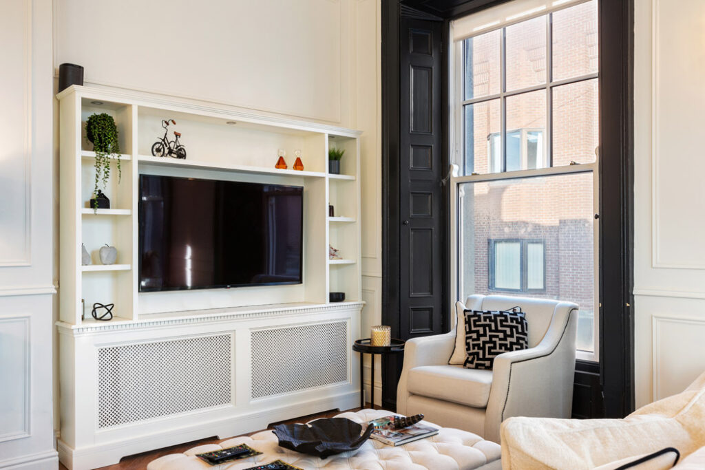 Ceiling heights are three metres, and the room has large, twin six-over-six sash windows and window boxes bringing in loads of light.