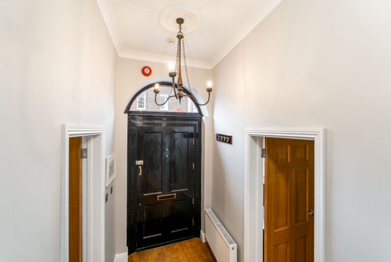 The arch brick surround of the chimney breast has also been revealed, echoing the curve above the front door fanlight below.