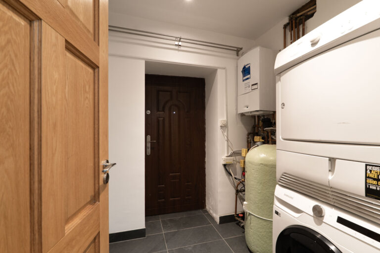 A sunburst mirror hangs above the bath. Each is lit by a rooflight above. There’s also a utility off the main bathroom.