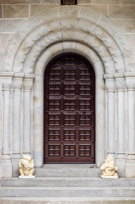 The front door entrance is between two towers with gargoyles standing sentry on either side, as if surveying proceedings.