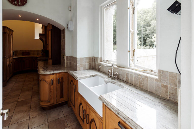 There are two kitchens in the residence: a carved oak design set into a nook of the large lounge space at entrance level, and a second in-frame option at garden level.