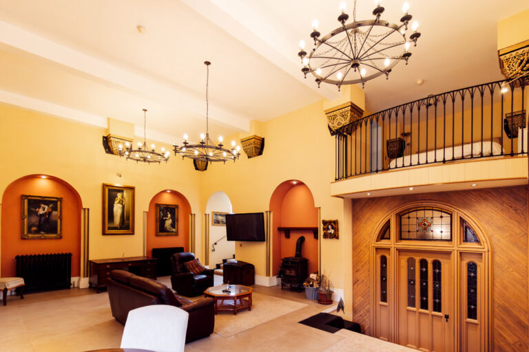 Walk through an arched inner door and you find yourself in a large lounge where seating is set around a wood-burning stove.