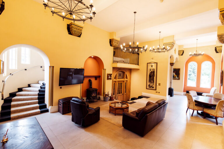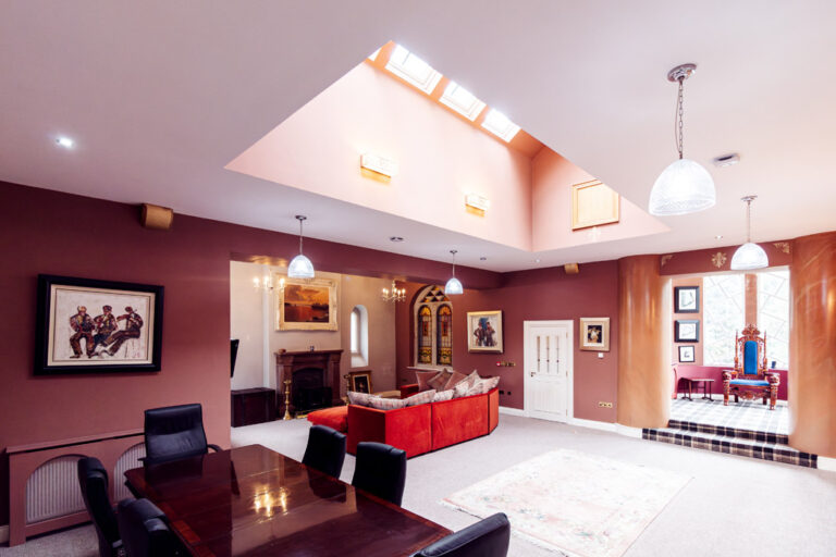 Inside it extends to a sizeable 501 square meters and is set over three storeys with eccentric architectural flourishes throughout.