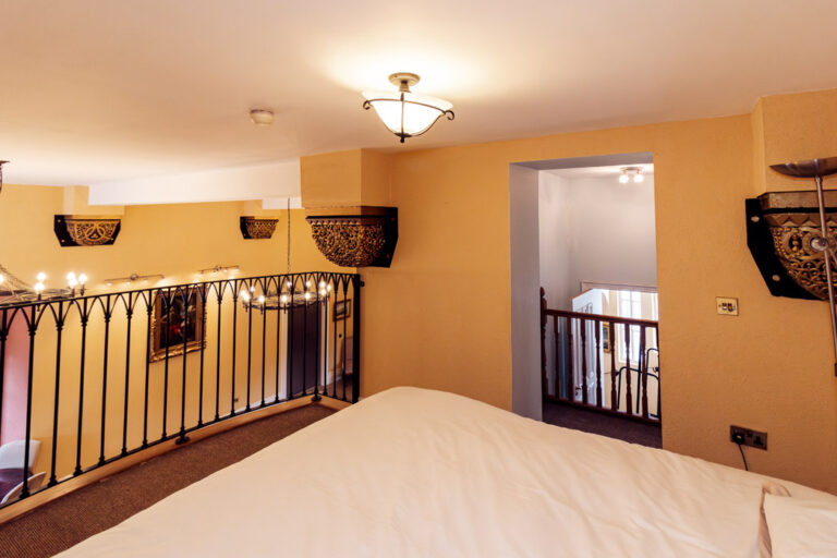 The mezzanine, which overlooks the large lounge on the floor above, is used as a third bedroom.