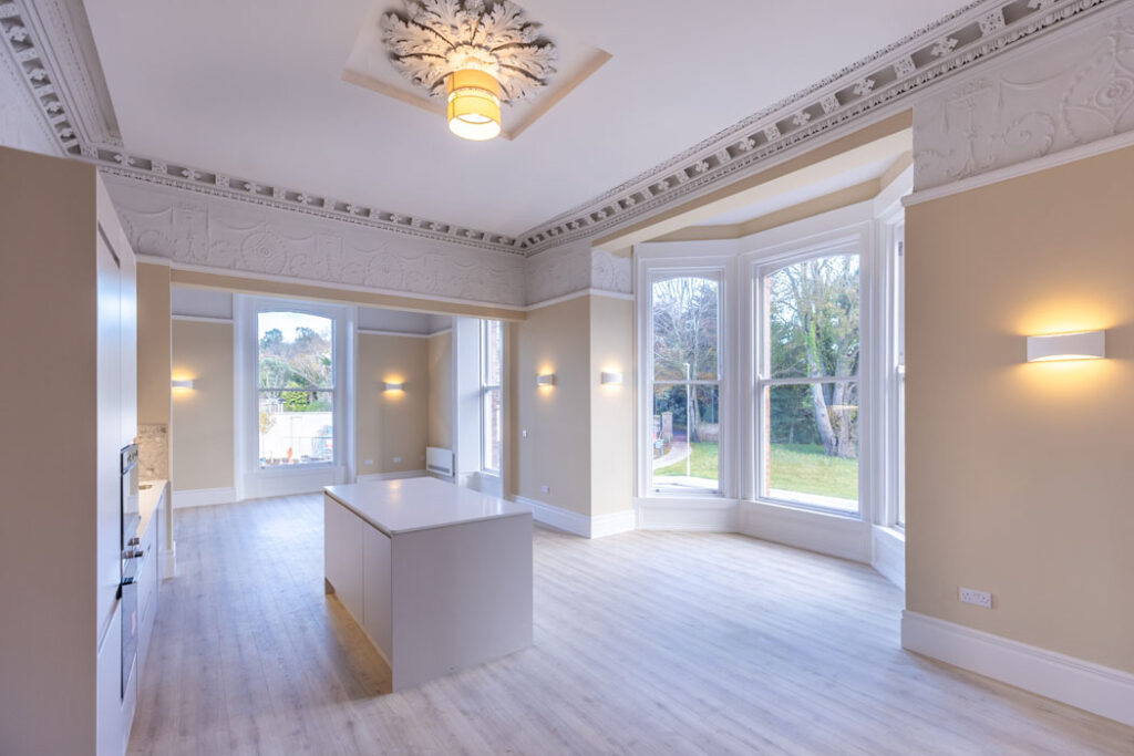 Within the period house that anchors the scheme, there are a number of two-bedroom apartments that boast original features, including lofty ceiling heights and decorative plasterwork.