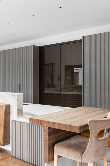 The panty is set behind another set of pivot doors this time finished in a smoked glass striated with bronze strips.