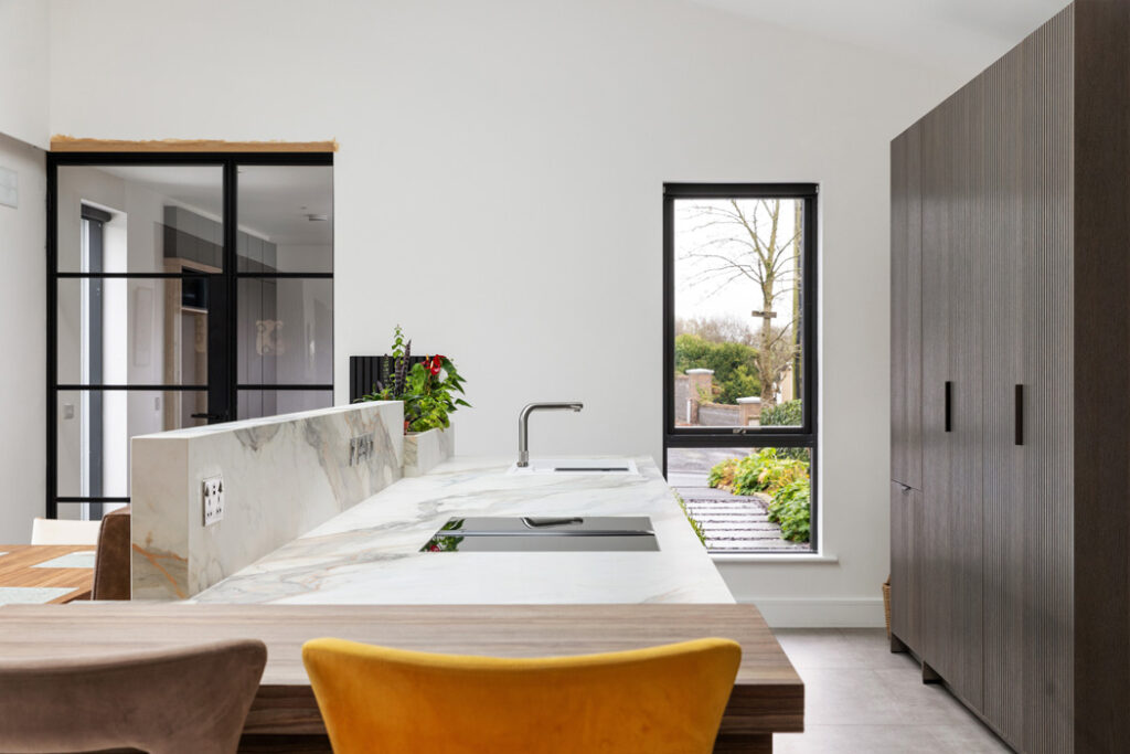"Normally, I don’t encourage putting it on the island as it is one of the messier areas, but the upright trough screens it from the eating area. I can now see out to the patio and garden through the six-metre-wide glass doors.”