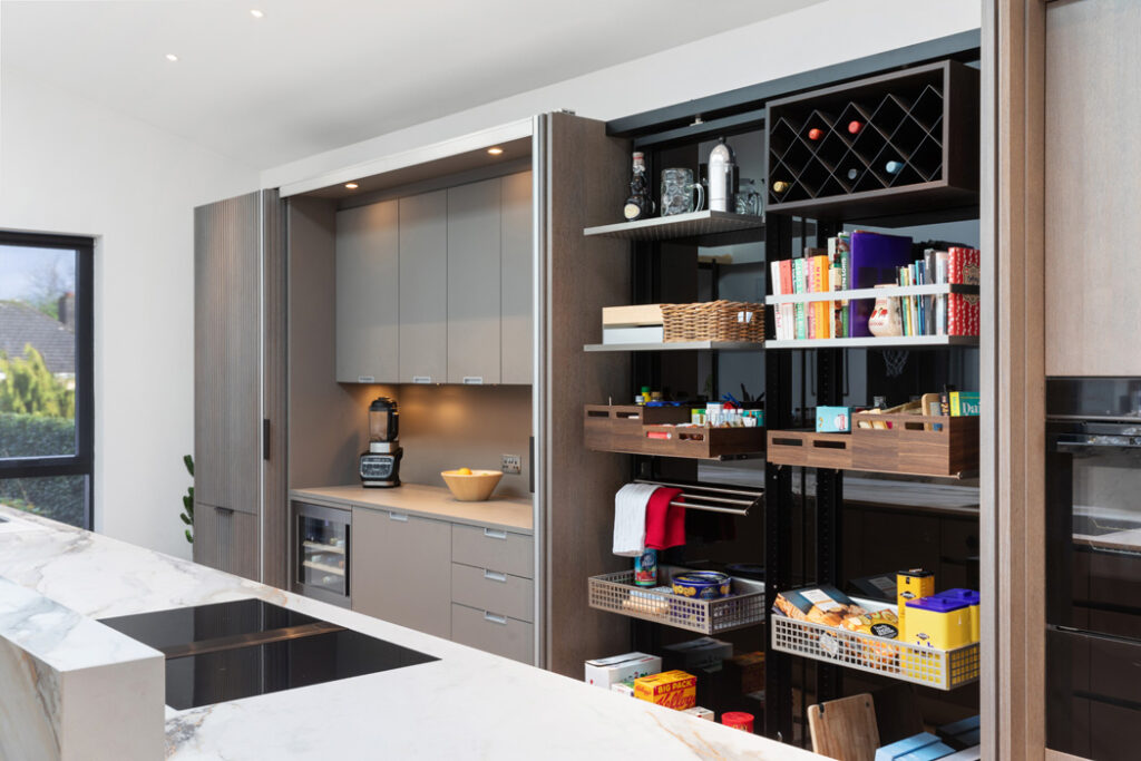 The cooking area is home to a steam oven and is housed within a silver oak veneered door that gives off warm bronze vibes.