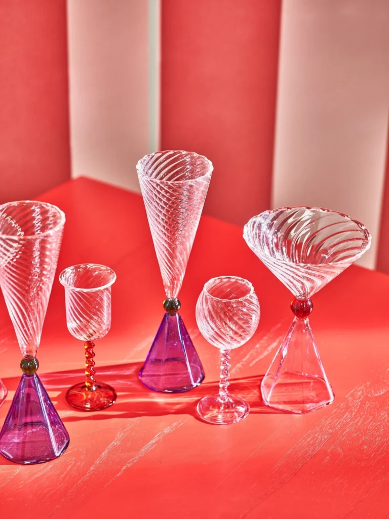 The blue-based champagne flutes and the pink-based cocktail glasses cost €29.50 for a set of two, excluding delivery, from Oliver Bonas.