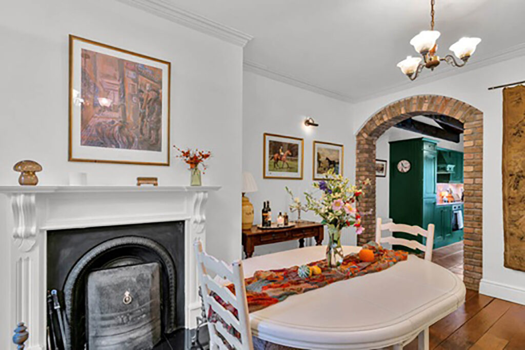 Both are relaxed, rather than formal. The dining area overlooks the garden, while the sitting room features easy seating all set around a cast-iron surround open hearth.