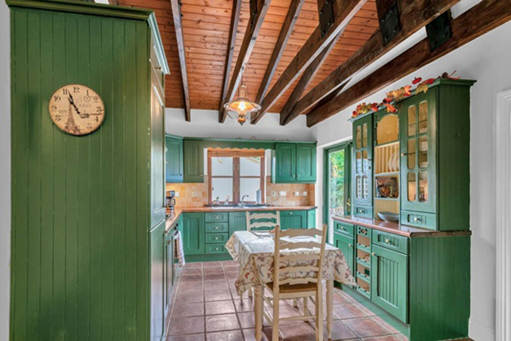 Across the hall is the kitchen, and through a brick arch is the breakfast room. The kitchen units are painted a racing green, and it has a timber-beamed sloping ceiling and a terracotta-tiled floor.