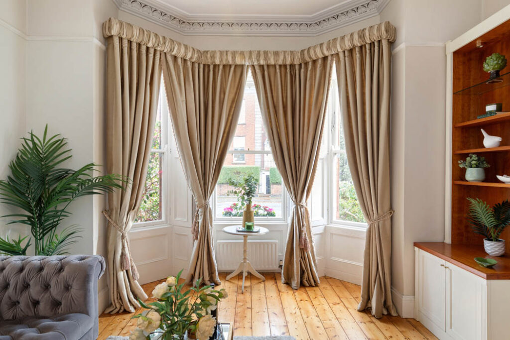 It has a bay window dressed in pleated curtains that have a ruched pelmet, all held back by curtain cords.