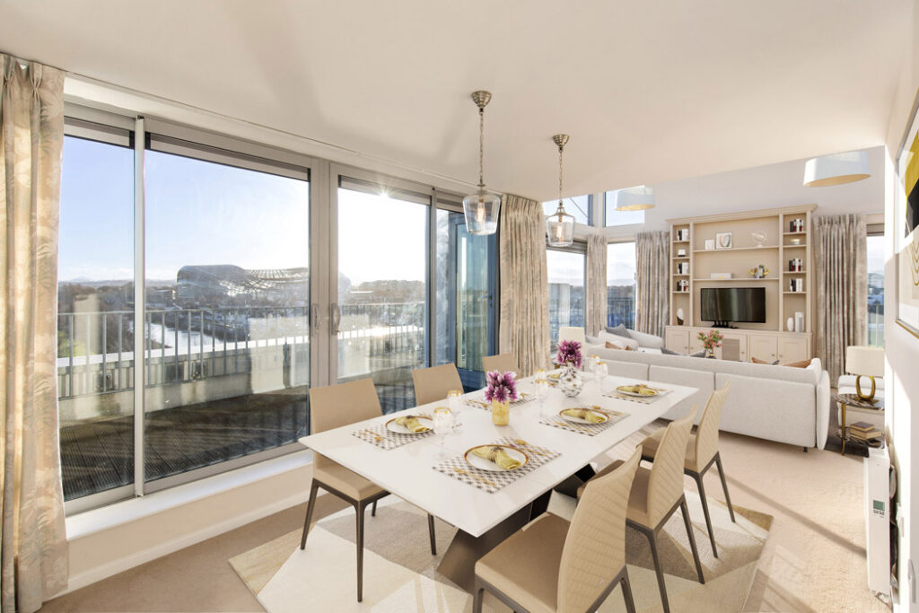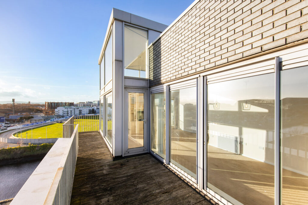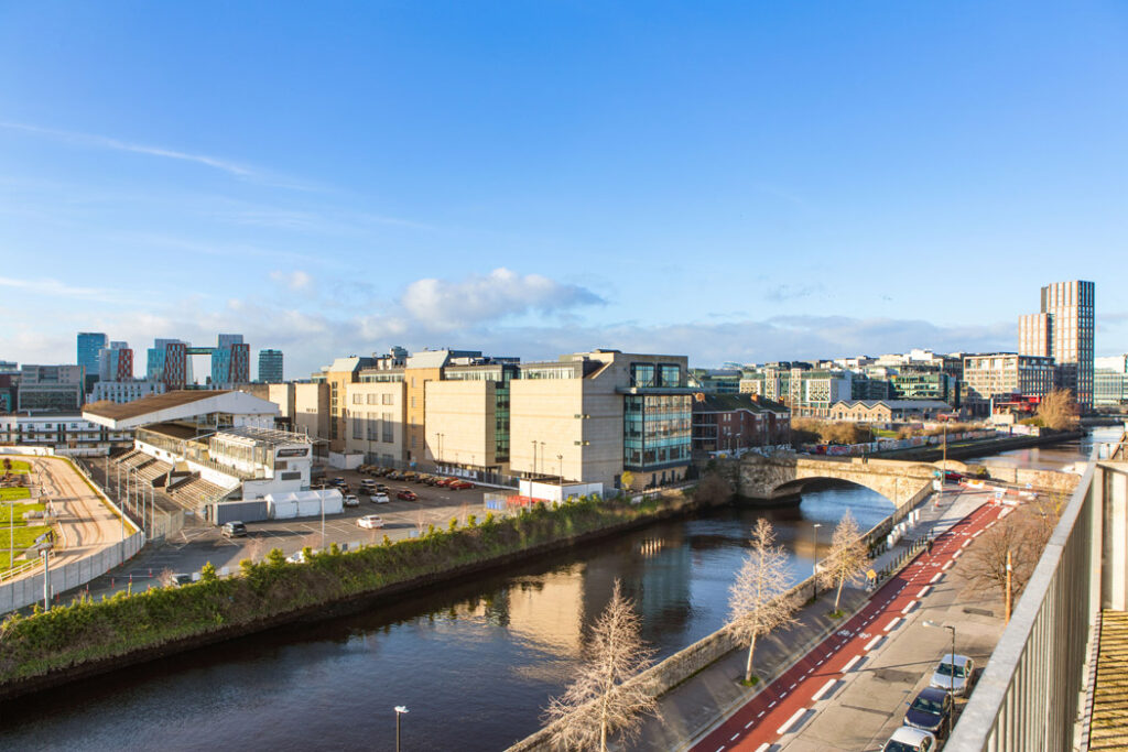Set along the river Dodder, this des res Dublin 4 apartment on the fifth floor has views west to the Aviva and east to Grand Canal Dock.