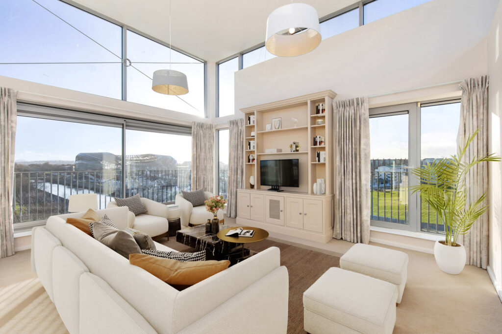 It is the only apartment on this floor and benefits from a wraparound balcony and views into the Aviva Stadium and across to Grand Canal Dock.