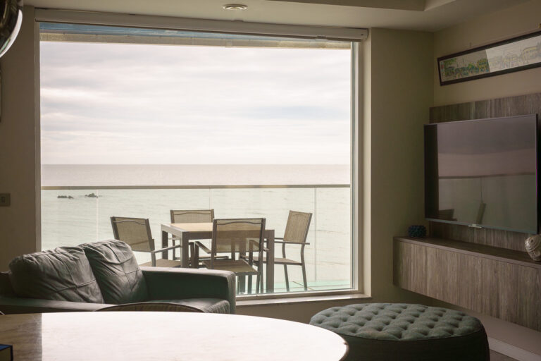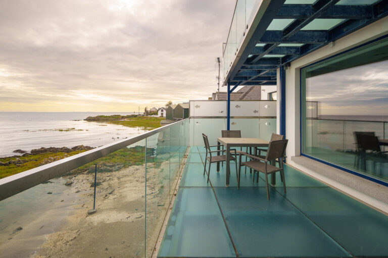Off these rooms is a large glass-bottomed balcony that appears as if made of sea glass, like it had been left at the tidemark to let the body of water patinate it.