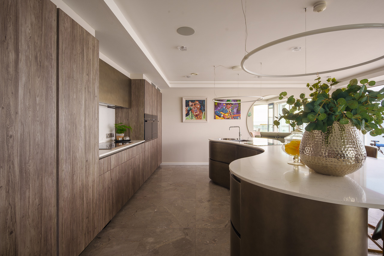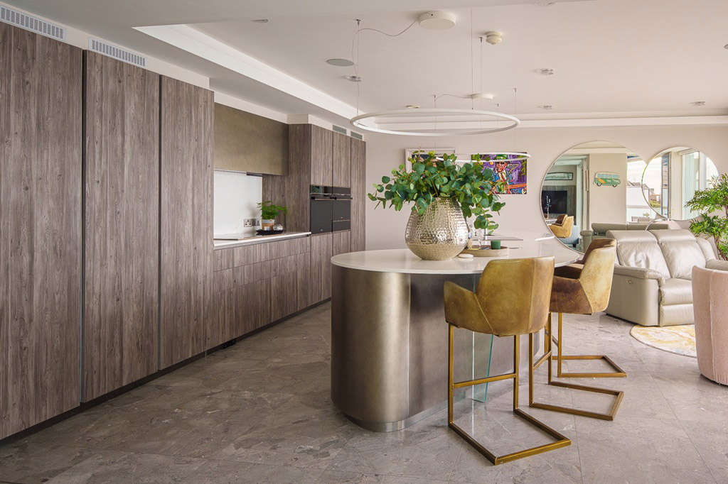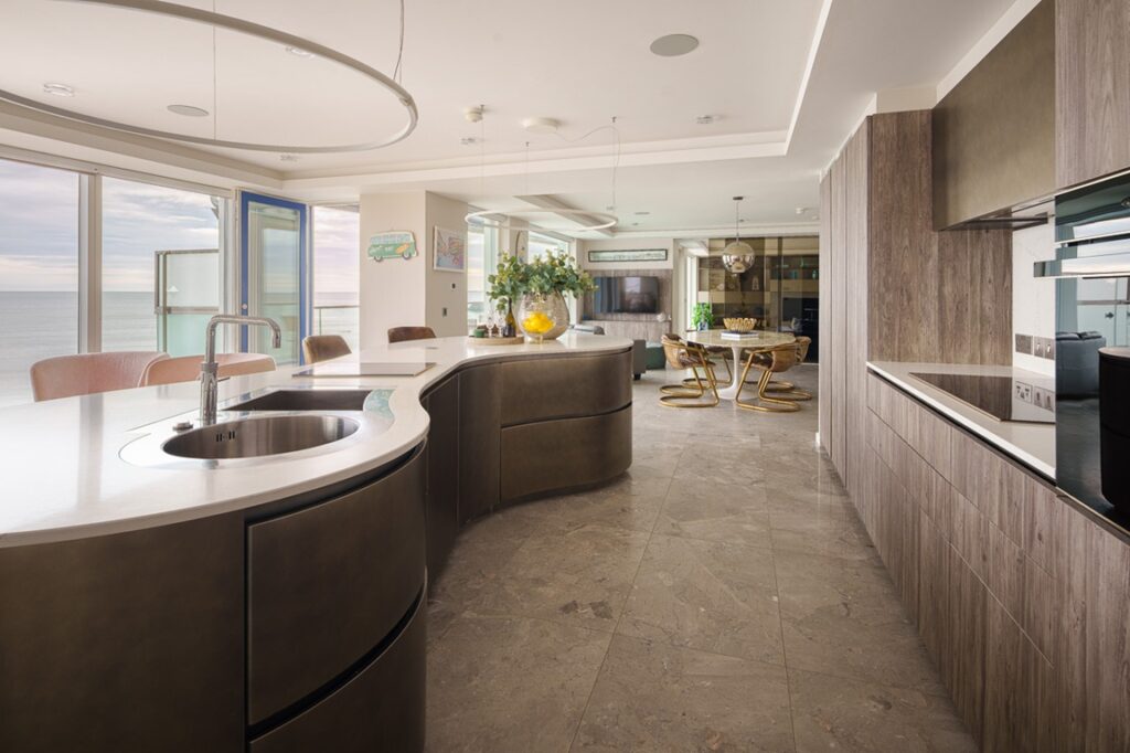 The first floor is an expansive, interconnecting space. From the serpentine-shaped kitchen island, the large porthole-shaped window is a nod to the nautical, and large picture windows frame the east-facing vista.