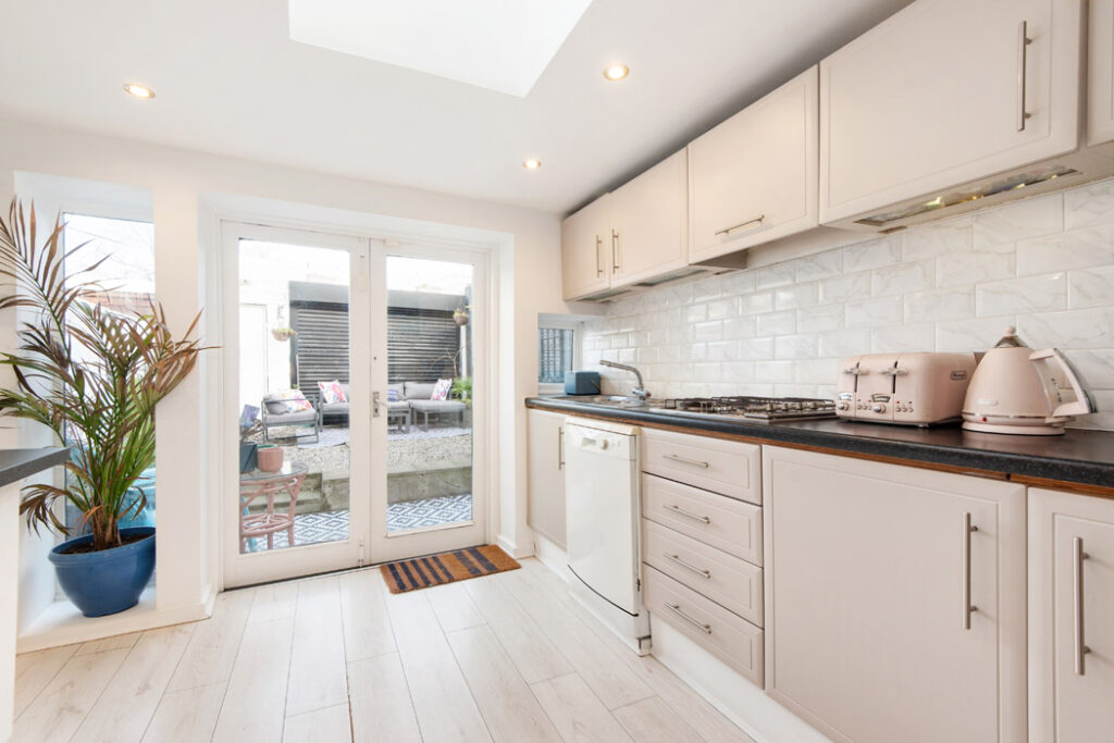 This features fawn-coloured cabinets and has double doors that open out to the east-facing courtyard, which gets lots of morning light.