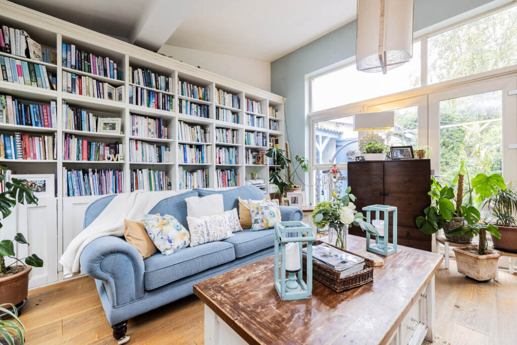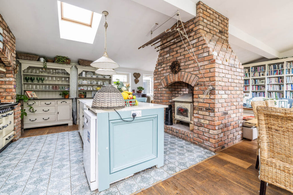 There’s a large broken plan space to the back that houses the kitchen, complete with a four-door, gas-operated Aga and a book-lined living room set around a wood-burning stove.