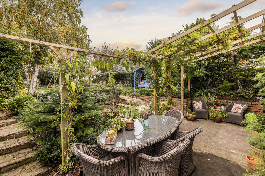 There’s also a dining area that opens out to the beautifully planted terrace, with a pergola overhead and steps up into the garden.