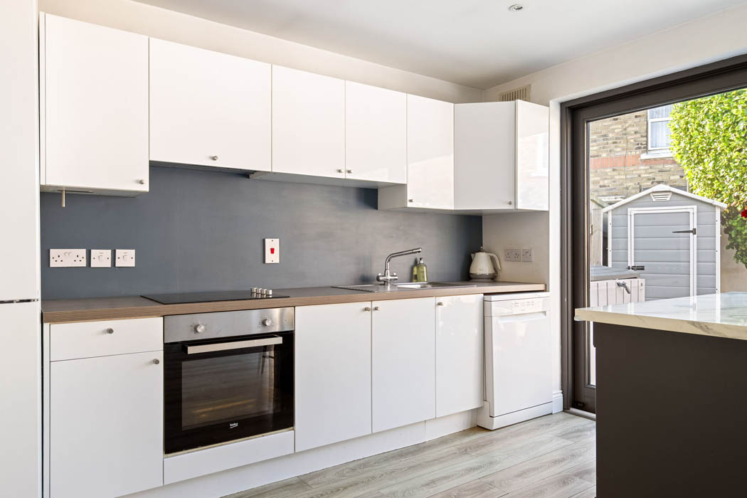 At the hall level, there is a large eat-in kitchen that runs the depth of the property.