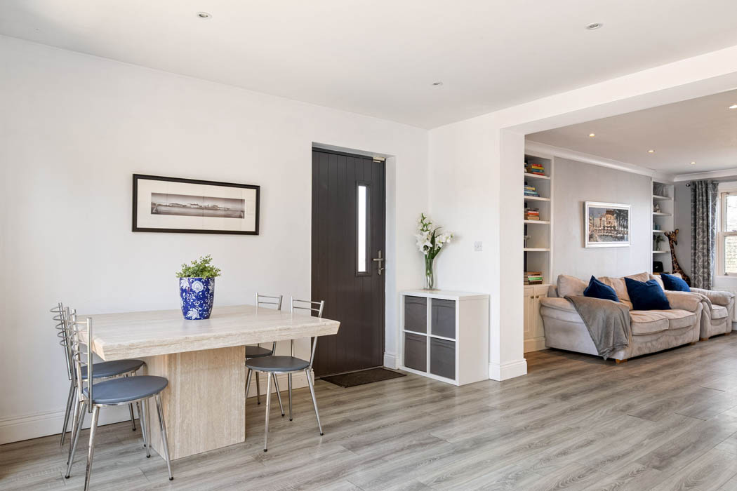 Within a large, interconnecting L-shaped space, there is a living room and a sizeable eat-in kitchen that extends the width of the property.