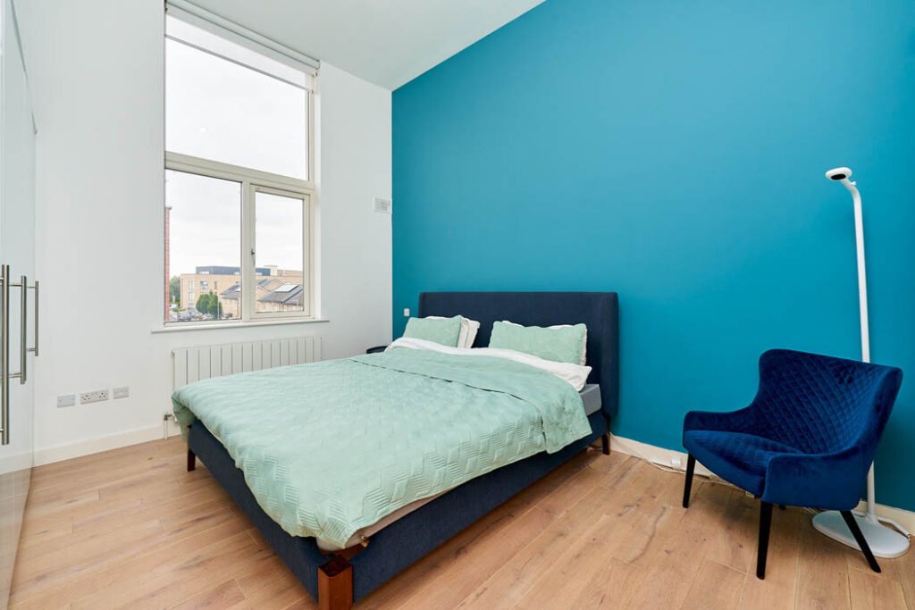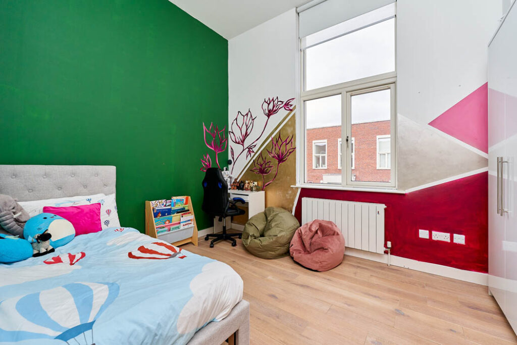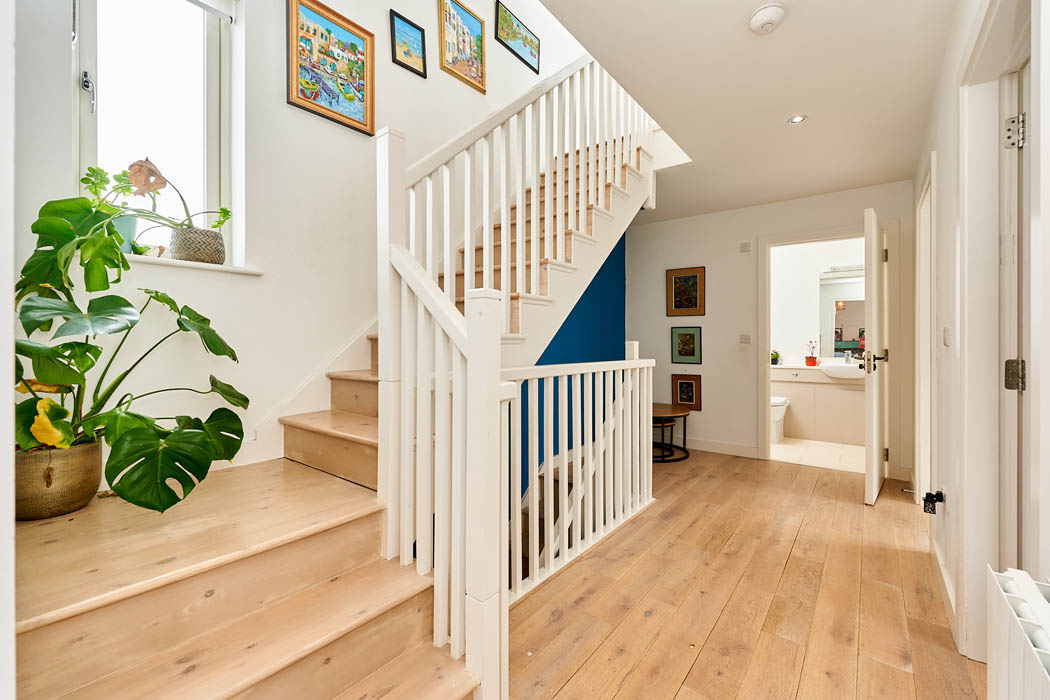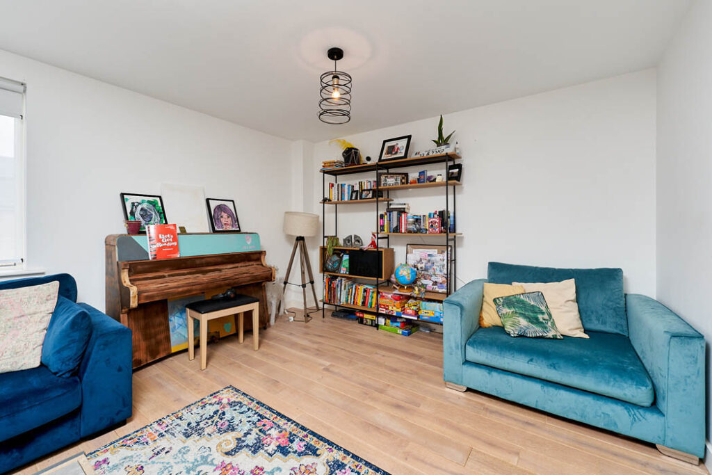 The dual-aspect living room is on the first floor and opens out to a balcony.