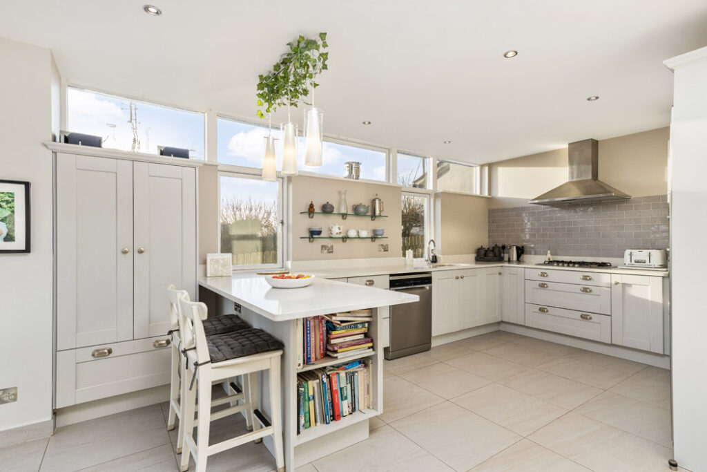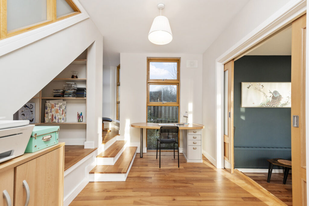 Laid out over different levels, the broken plan layout moves from a large dual aspect kitchen, complete with clerestory windows to bring light deep into the space.
