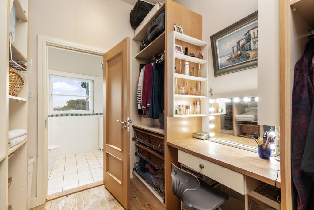 The bedroom is free of visual clutter, for there is a walk-through wardrobe, complete with a built-in dressing table that leads through to an ensuite bathroom.