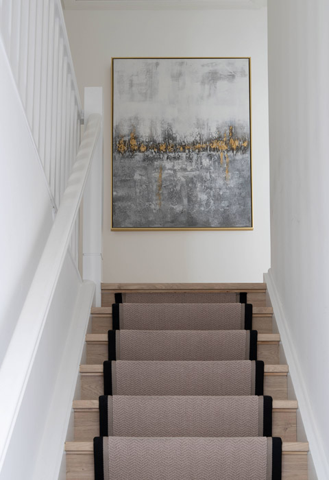 The stairs have been carpeted in a smart runner with a large framed painting hanging on the return.