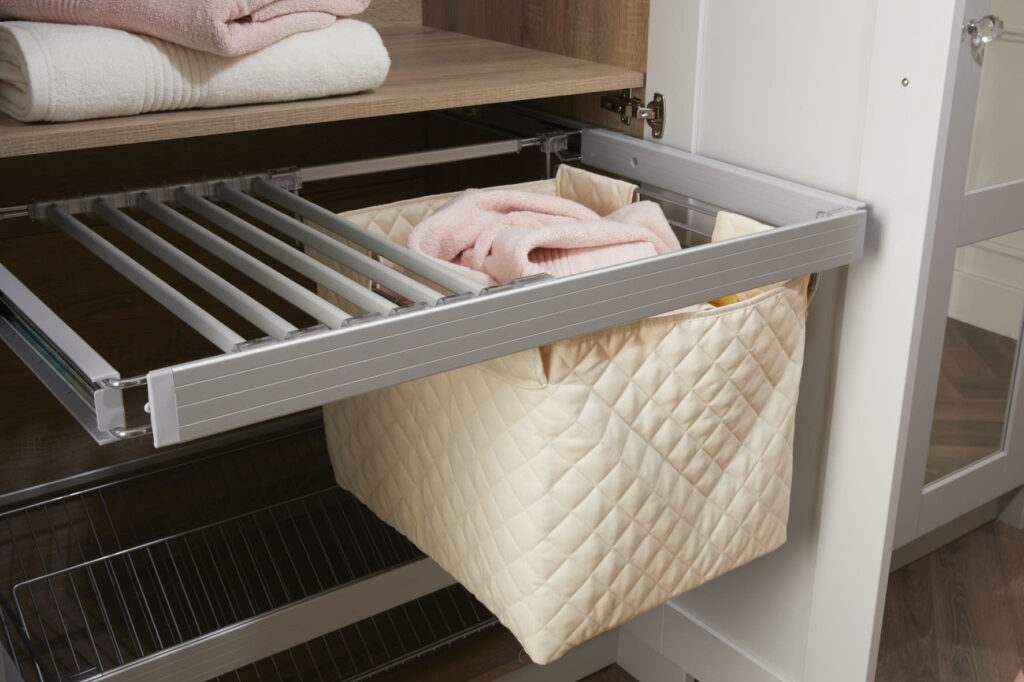A clever panelling centre wardrobe insert that can be used as a laundry basket or a place to store sweaters