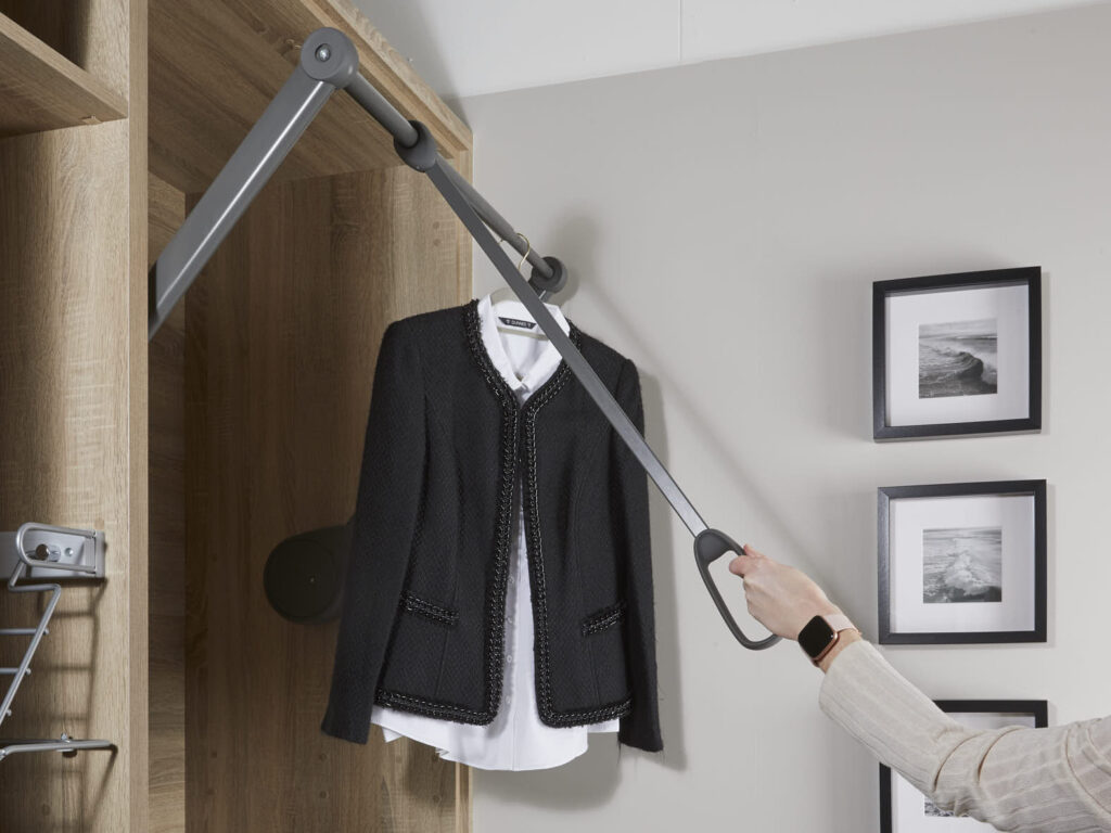 For now, her eight-year-old, who is very good at keeping her room tidy, but can’t reach the hanging rail, hooks garments onto the wardrobe door pulls and door handles.
