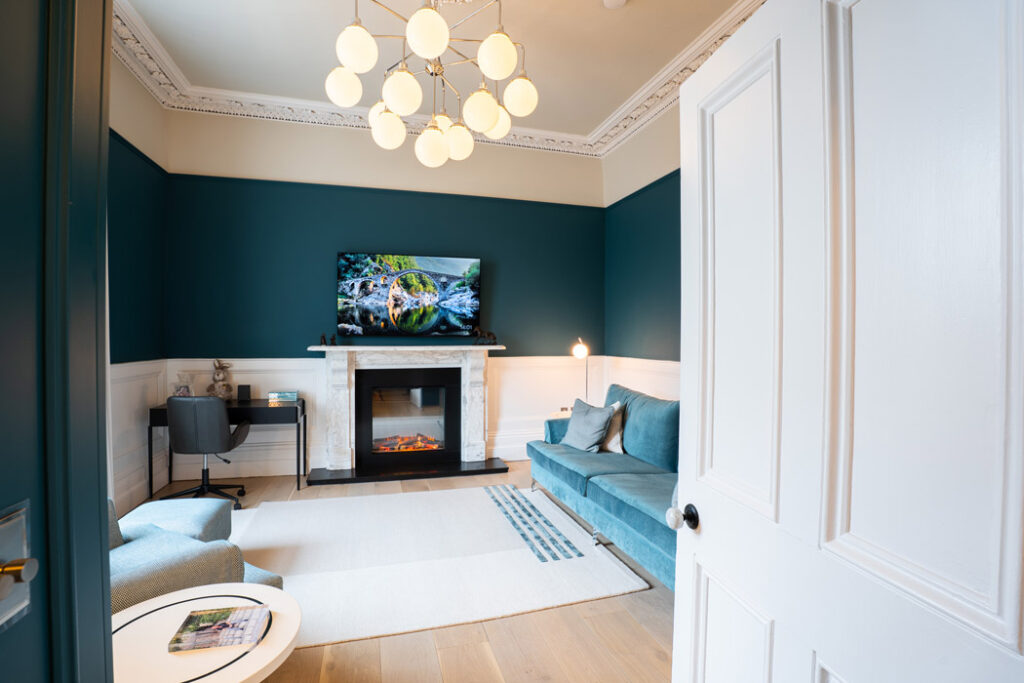 At the entrance level, the hall has been returned to its former glory with a central pendant by Hudson Valley Lighting illuminating the coving and ceiling rose.